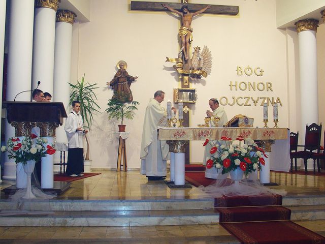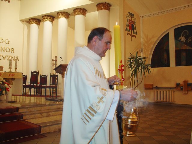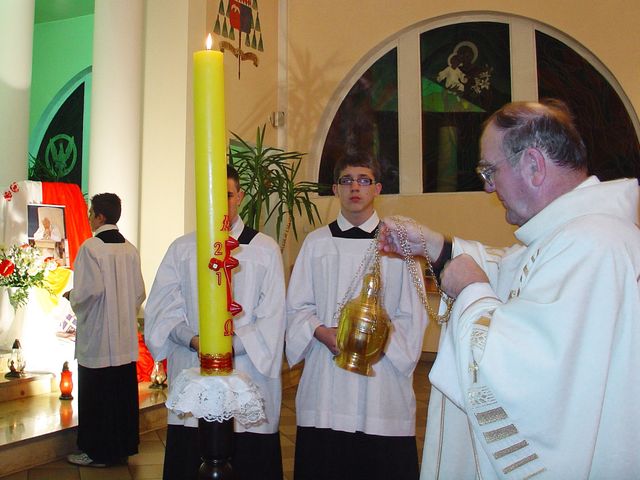 Wieczór i noc w Wielką Sobotę to szczytowy moment całego Roku Liturgicznego. Obchodzimy wtedy Wielką Noc, pamiątkę nocy w której nasz Pan przeszedł ze śmierci do życia. Uroczystą Mszę Wigilli Paschalnej połączoną z Procesją Rezurekcyjną rozpoczęliśmy o godz. 22:00, gromadząc się przy ognisku przed kościołem. Przy ognisku poświęcony i zapalony od niego, został nowy paschał i procesja wkroczyła wnosząc „Światło Chrystusa” do kościoła. Następnie ks. Leon Praczyk COr zaśpiewał Orędzie Wielkanocne, po czym nastąpiła liturgia słowa. Po trzecim czytaniu, zaśpiewaliśmy hymn „Chwała na wysokości Bogu”, podczas którego biły wszystkie dzwony. Po homilli odnowione zostały przyrzeczenia chrzcielne i rozpoczęła się liturgia Eucharystyczna. Na koniec, wyruszyliśmy z Procesją Rezurekcyjną, z Najświętszym Sakramentem, śpiewając „Wesoły nam dzień dziś nastał”. Msze św. sprawowali ks. Leon Praczyk COr oraz ks. proboszcz Krzysztof Górski COr.